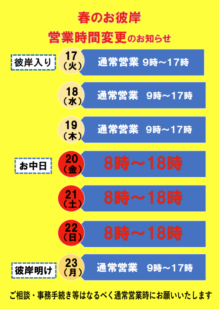 春のお彼岸期間中の営業時間変更のお知らせ